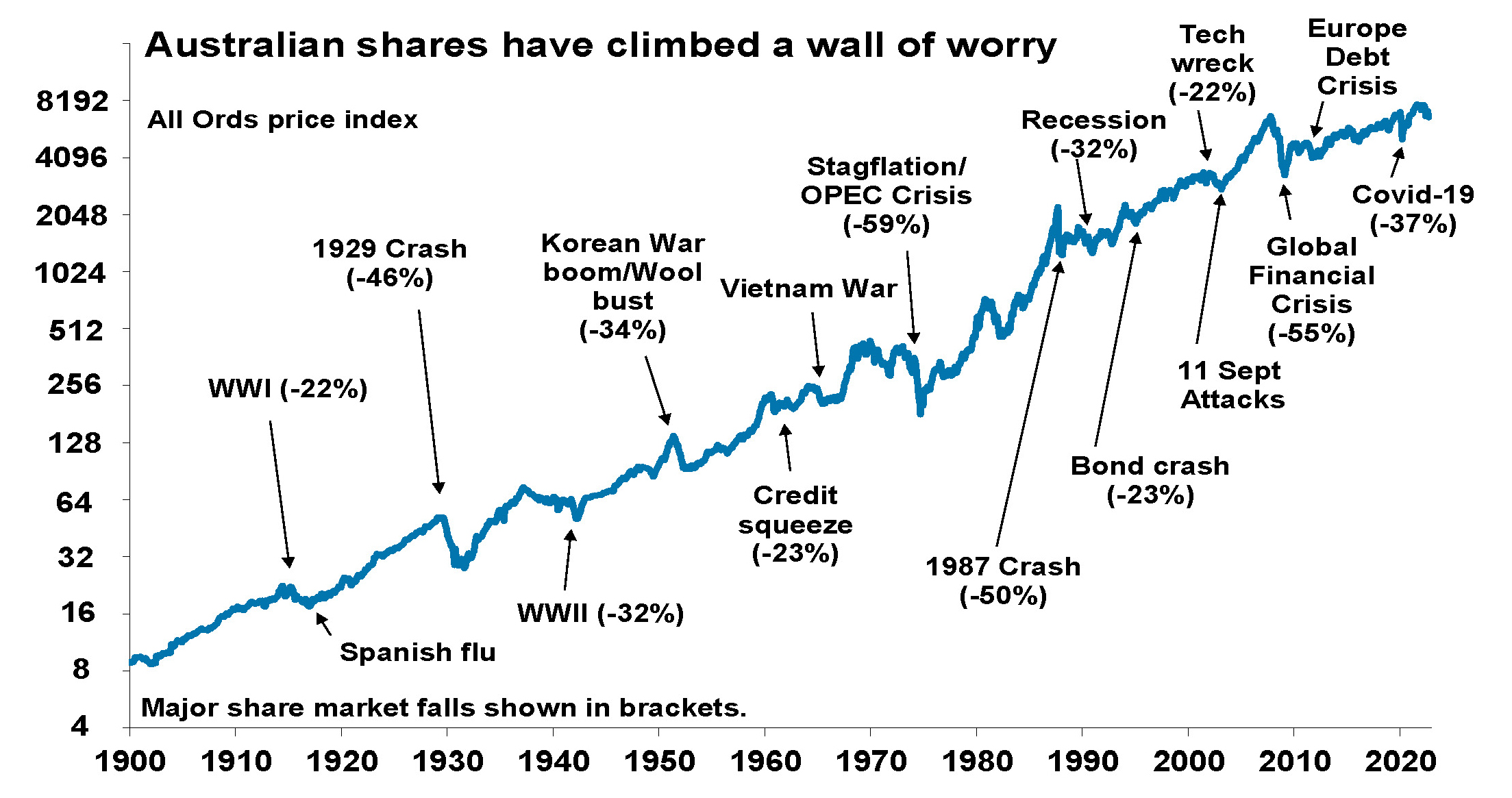 First, while they all have different triggers and unfold differently, periodic share market falls are healthy and normal. Sometimes they are just 5% to 20% corrections, but every so often they can be deep bear markets with falls up to around 50% as in the GFC. But while share market pullbacks can be painful, it’s the way the share market has always been, so they are nothing new. As can be seen in the next chart shares climb a wall of worry over many years but with numerous events dragging them down periodically, but with the long-term rising trend ultimately resuming.