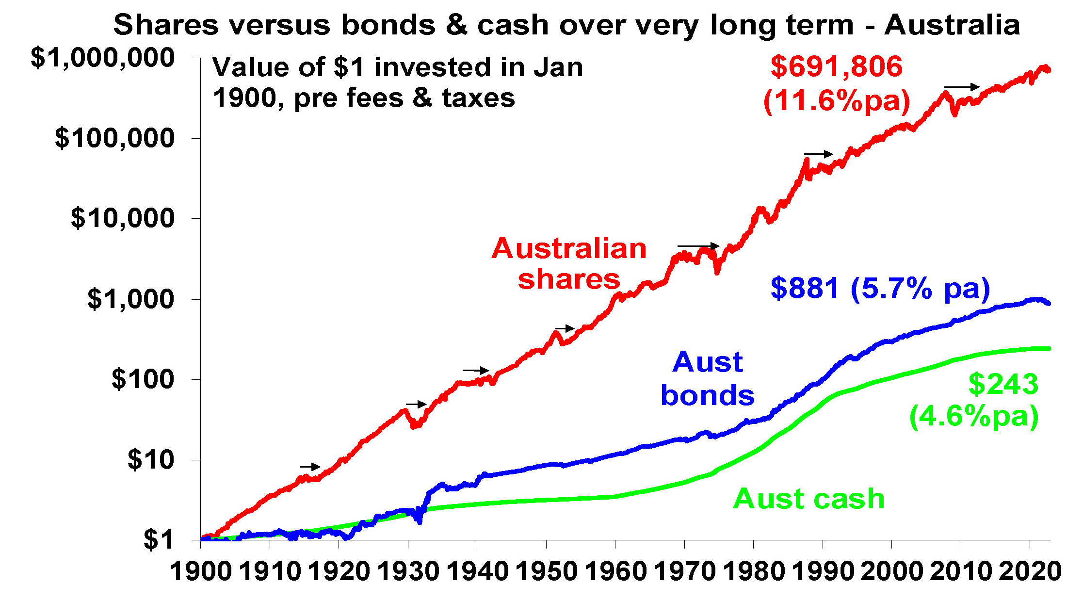 Bouts of volatility are the price we pay for the higher longer-term returns from shares compared to other assets like cash and bonds. The next chart shows the value of $1 invested in various Australian assets in 1900 allowing for the reinvestment of dividends and interest along the way. That $1 would have grown to $243 if invested in cash, to $881 if invested in bonds and to $691,806 if invested in shares. While the average return since 1900 is only double that in shares relative to bonds, the huge difference between the two at the end owes to the impact of compounding returns on top of returns. So, if we want to grow our wealth we need an exposure to growth assets like shares to make the most of the power of compound interest, but with that comes rough patches every so often.