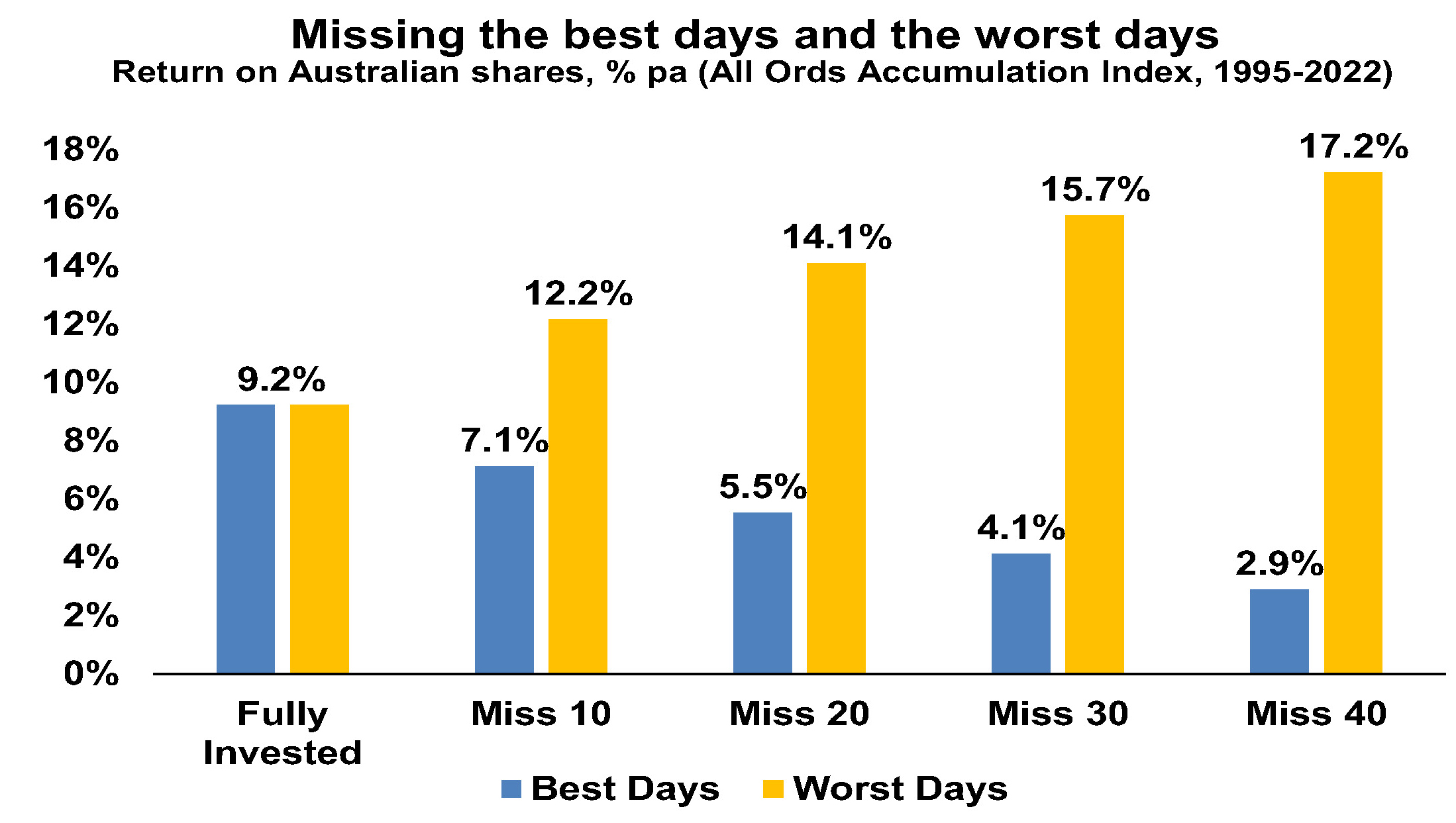 Of course, you may be thinking “but I will reinvest once uncertainty is removed”. But the risk is you don’t feel confident to get back in until long after the market has fully recovered, which may be well above the level you sold out at. Trying to time the market is very difficult. A good way to demonstrate this is with a comparison of returns if an investor is fully invested in shares versus missing out on the best (or worst) days. The next chart shows that if you were fully invested in Australian shares from January 1995, you would have returned 9.2%pa (including dividends but not allowing for franking credits, tax and fees).