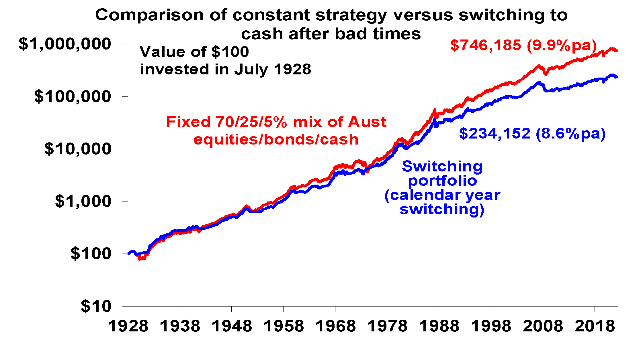 Over the long run the switching portfolio produces an average return of 8.6% pa versus 9.9%pa for the balanced mix. From a $100 investment in 1928 the switching portfolio would have grown to $234,152 by September but the constant mix would have increased to $746,185.