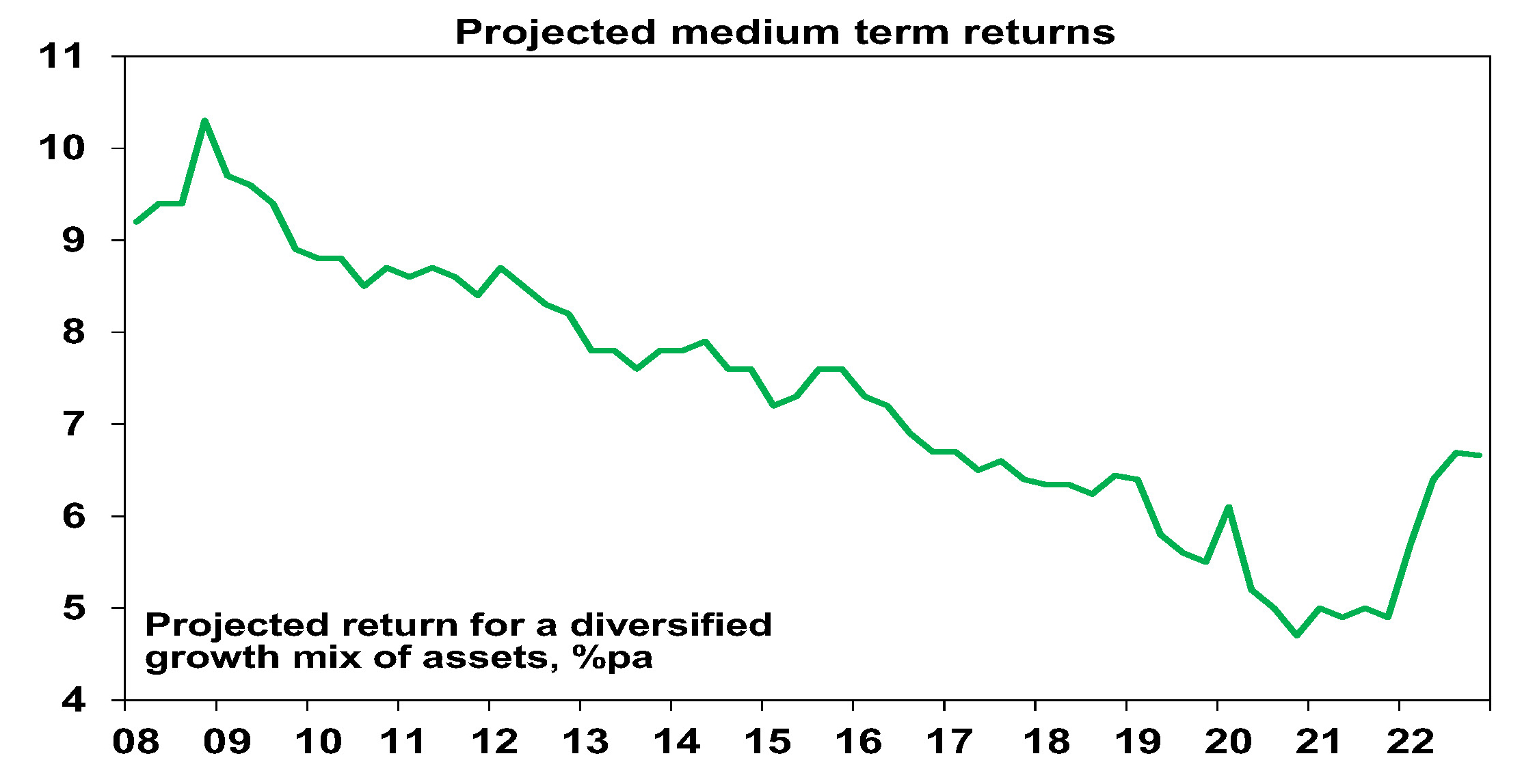 When shares and all assets fall in price, they’re cheaper and offer higher long-term return prospects. As a result of the fall in share and bond prices (and the resultant decline in PEs and rise in dividends yields and bond yields) our estimated medium term return projections for a diversified growth mix of assets has improved from around 4.9%pa to around 6.7%pa. So, the key is to look for opportunities’ pullbacks provide. It’s impossible to time the bottom but one way to do it is to “average in” over time.