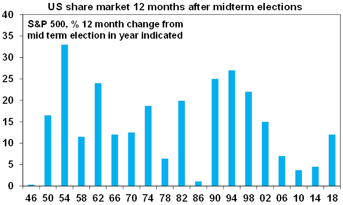 Seasonality also starts to become more positive for shares into year end and the US share market has consistently rallied after US mid-term election years with year 3 in the 4 year presidential cycle being a strong year on average after year 2 (ie this year) which is normally a poor year.