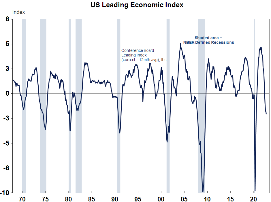 US economic data was mostly soft. Jobless claims remain low and industrial production was solid, but business surveys point to weakness ahead with both the New York and Philadelphia manufacturing surveys for October being weak. The US leading index in September fell to levels around where recessions have started in the past. Housing starts, home sales and home builder conditions all fell indicating that the interest sensitive housing sector is being hit hard by higher rates. Interestingly the Fed’s Beige Book of anecdotal evidence notes that while price and wages growth remain elevated there are pockets of easing.