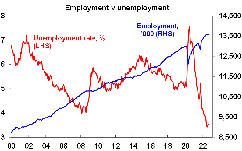 The jobs market remains tight but looks to be starting to cool. Employment was virtually flat in September as were hours worked and both unemployment and underemployment were unchanged at 3.5% (around its lowest in more than 48 years albeit up from 3.41% to 3.54%) and 6% respectively. While the labour market remains very tight it appears to be softening at the edges. Three month average jobs growth has slowed to just 200 jobs a month down from 54,000 jobs a month six months ago and monthly job opening data also appears to be slowing. Unemployment may still fall a bit further, but through next year its likely to be rise above 4% as the reopening surge in jobs is behind us, rate hikes will hit demand and foreign workers and immigrants are returning rapidly which will add to labour supply. With the jobs market still tight and likely to feed through to faster wages growth the RBA is likely to hike rates again next month, but the signs of softening are likely to see it stick to a 0.25% hike rather than revert to 0.5%.