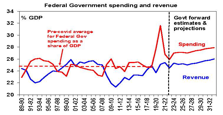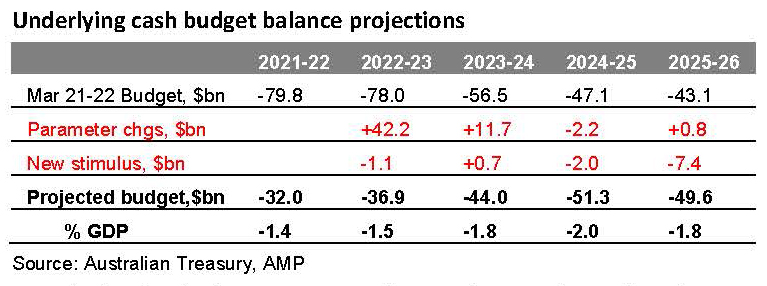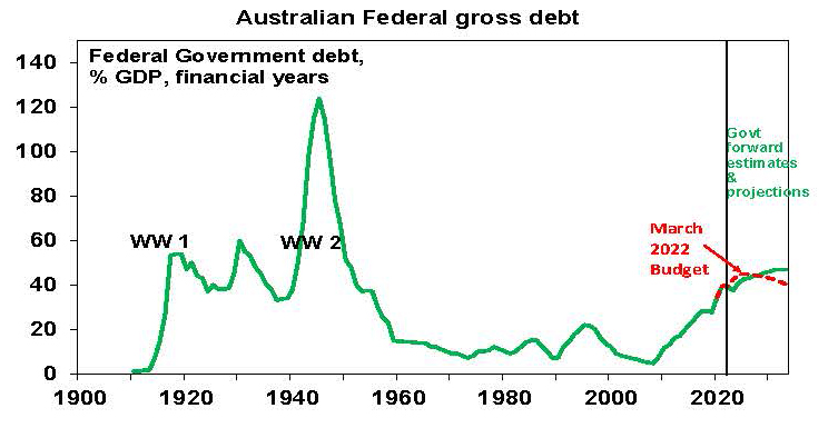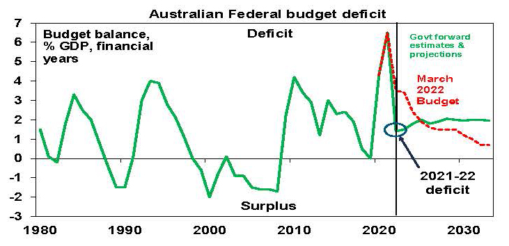 Budget deficit projectionsThe Government’s revised budget projections are shown in the next table. Despite increased spending, mostly associated with election promises, the deficit projections are lower for this year and next than in March. This is mostly due to another budget windfall from higher commodity prices, lower unemployment for now & higher inflation – which boosts revenue relative to spending (see the line called “parameter changes”). This was the main driver of the 2021-22 deficit coming in at $32bn rather than the $80bn back in March. It’s reduced the deficit by $42.2bn this year and $11.7bn next. Also helping are that any new spending measures are largely offset by budget savings such that “new stimulus” this year is just $1.1bn and next year there is no new stimulus. As a result, the expected deficit for this year has fallen to $36.9bn and for next year to $44bn (from $78bn and $56.5bn back in March). This lack of extra significant stimulus when inflation pressures are strongest is economically responsible.