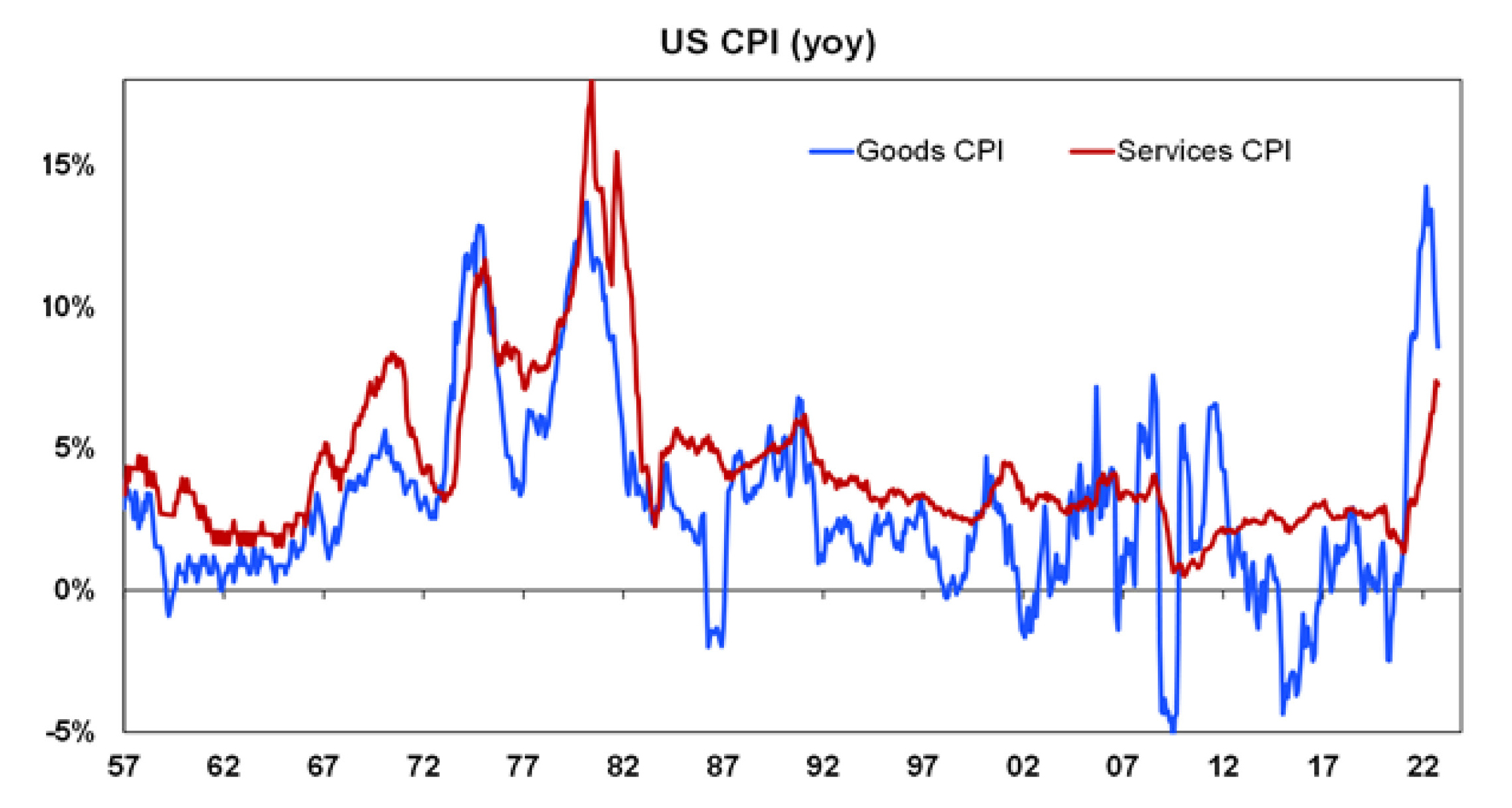 First, it’s been a long time coming, but underlying US inflation finally appears to be easing. Headline inflation in October dropped to 7.7%yoy (well down from a peak of 9.1% in June) but more importantly core (ex food and energy) inflation came in at a slower than expected 0.3%mom, easing to 6.3%yoy from 6.6%yoy. Prices for used cars, household furnishings, medical care and airfares fell. US goods price inflation has rolled over and this tends to lead services price inflation.