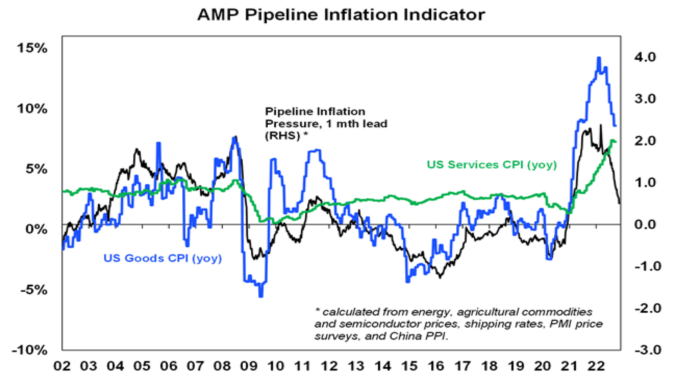 This is all consistent with falls in our Pipeline Inflation Indicator due to easing supply constraints, freight rates, commodity prices and cost pressures in business surveys. This Indicator correlates more with goods inflation (which is slowing), but this leads services inflation so its likely to slow too. A year ago global growth, US wages, rents, commodity prices, US public spending, anecdotes, car prices, money supply growth, freight rates and business surveys were all pointing up for US inflation. Now they are all slowing, or clearly pointing down.