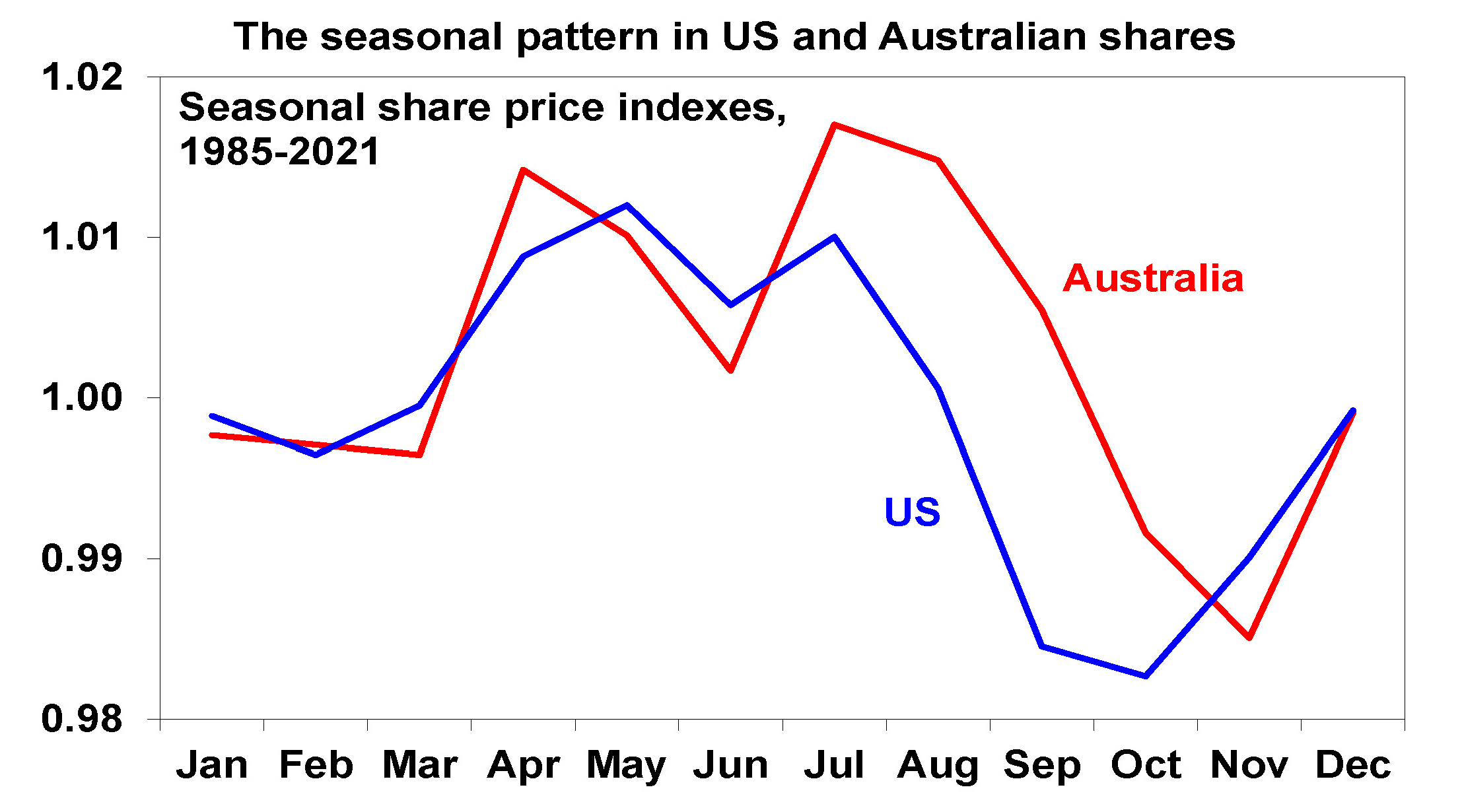 We have now entered a positive part of the year for shares from a seasonal perspective, with US, global and Australian shares tending to rally from October/November into year end and out to the middle of the next year, reflecting an end to tax loss selling in the US, new year cheer and a lack of capital raising over the Christmas/New Year period.