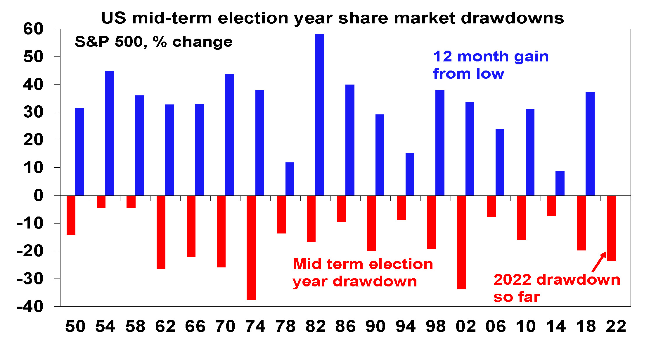 - But the increasing evidence of a peak in US inflation (which will lead Australian inflation), central banks slowing (or moving to slow) their rate hikes, China moving to do more to support its economy, along with positive seasonals and the track record of US shares rallying after mid-term elections indicate we may have seen the low in share markets and add to our confidence the next 12 months will be positive for shares.