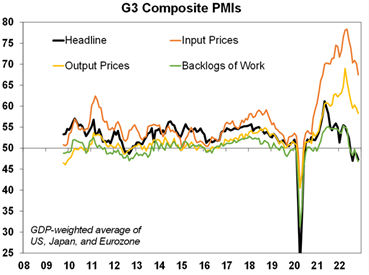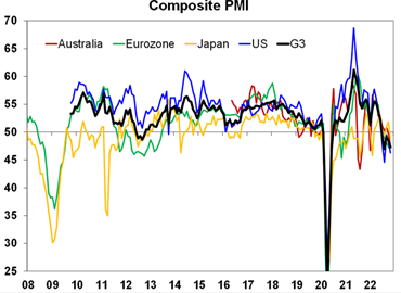 But what about the Reserve Bank of New Zealand’s 0.75% hike? The RBNZ not only undertook another supersized hike taking the cash rate to 4.25% but also raised its guidance to a peak of 5.5%. All at the same time as forecasting a recession next year. However, I wouldn’t read too much of this through to other central banks: NZ faces a higher risk of a wage-price spiral than other countries with a tighter for longer labour market; the RBNZ has a history of being a bit erratic; it appears to be giving little weight to the lags with which monetary policy impacts the economy whereas other central banks are now paying pay more attention to lags; and don’t forget it only reviews rates seven times a year versus 11 for the RBA. And if NZ consumers “cool their jets” as Governor Orr wants, and as seems likely, 5.5% won’t be reached.
