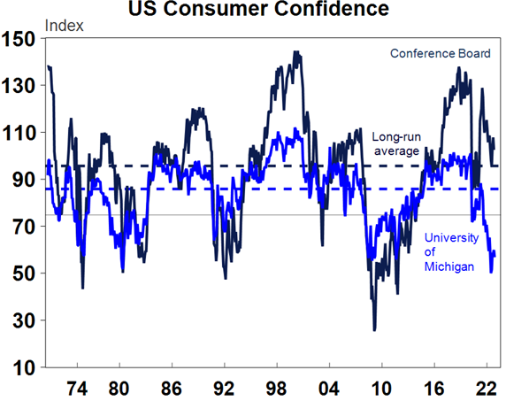 The good news for the Fed is that long term consumer inflation expectations in the US remain low at 3%, well down from 10% in 1980 indicating that inflationary psychology is far less entrenched today than in the early 1980s so it should be possible for the Fed to get inflation back down without a deep recession.
