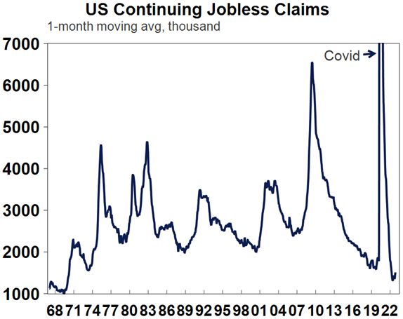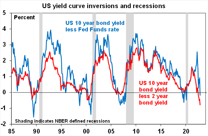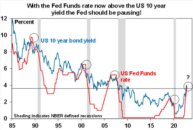 In fact, with recession risk in the US now high – we think its probably now up around 55% - and forward-looking price indicators easing there is now a strong argument for the Fed to pause on the grounds that a recession or significant slowdown will lead to much lower inflation ahead. On previous occasions when the Fed Funds rate rose above the 10-year bond yield in 1989, 2000, 2006 and 2019 the Fed paused rate hikes knowing that yield curve inversions often precede recessions. To continue hiking too far from here could risk a deep recession which invariably suppress inflation. So even if the Fed goes a bit further its looking likely we may be nearer the top than market expectations and the Fed’s dot plot for a rise to 5% indicate.