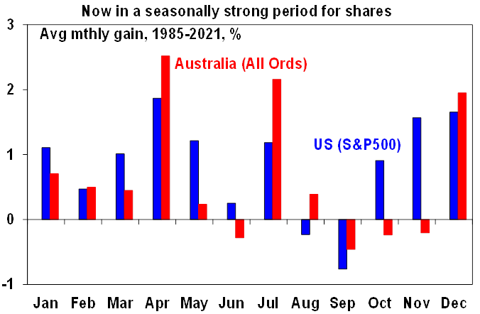 Shares are not completely out of the woods yet as central banks continue to tighten, uncertainty about recession remains high and geopolitical risks continue. However, we are now in a favourable part of the year for shares from a seasonal perspective and we see shares providing reasonable returns on a 12-month horizon as valuations have improved, global growth ultimately picks up again and inflationary pressures ease through next year allowing central banks to ease up on the monetary brakes.