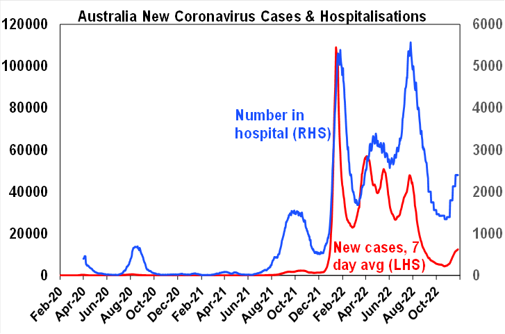 In Australia, a speech by RBA Governor Lowe reiterated the Bank’s determination to get inflation back down and its expectation to raise interest rates further but also repeated that it’s not on a pre-set path and could step back up to 0.5% hikes or pause depending on what’s warranted. Given stronger than expected wages and jobs data lately, the risks around a prices-wage spiral and the absence of a meeting in January we remain of the view that another 0.25% hike is likely next month. But a pause remains likely from early next year with the cash rate peaking in the low 3’s - our base case is 3.1% but the risk is 3.35% - as by early next year there will be enough evidence indicating growth is slowing sharply and inflation is peaking.