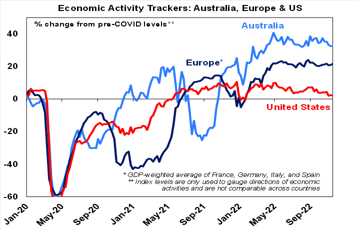 Our Australian Economic Activity Tracker was little changed over the last week with a slight lift in consumer confidence but a further fall in restaurant bookings. It remains down from recent highs. Our US Tracker was little changed, but our European Tracker rose remaining surprisingly resilient.