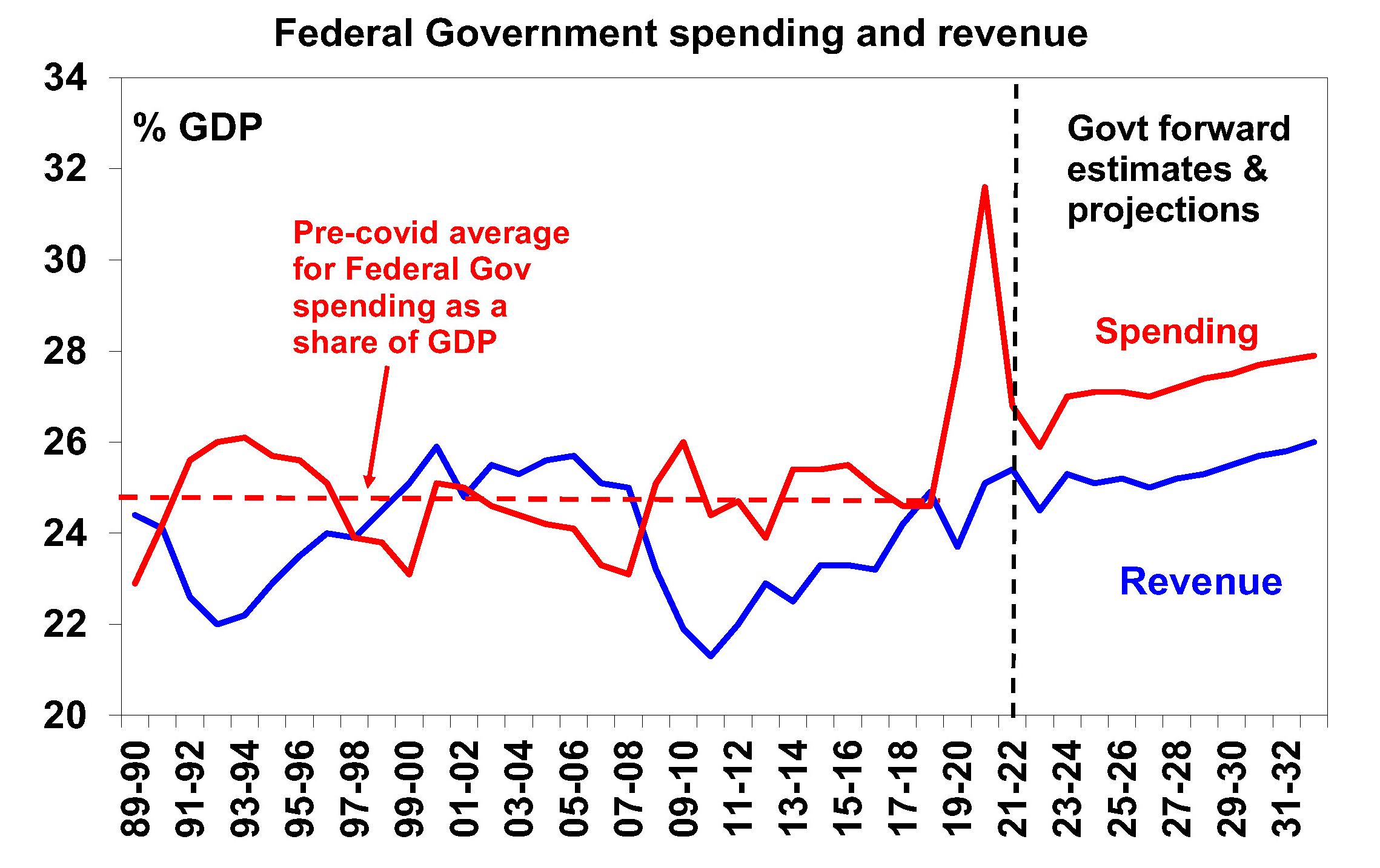 The reaction to the inflationary malaise of the 1970s was the economic rationalist policies of Margaret Thatcher, Ronald Reagan and Bob Hawke and Paul Keating in Australia. These focussed on boosting the ability of the economy to supply goods and services by: limiting government involvement in the economy through policies such as deregulation and privatisation; policies to boost competition; measures to boost incentives by lowering tax rates; and labour market reform to make labour markets more flexible. This all helped lower inflation. Now as a result of the problems highlighted by the GFC, rising inequality, stagnant wages, aging populations, climate concerns and a collective memory loss regarding the lessons of the past there is a backlash against economic rationalist policies and more support for government intervention in the economy. It’s evident in Australia, for example, with the rising trend in government spending and revenue as a share of the economy, widespread pressure to raise taxes, together with measures to return to multi-industry bargaining within the labour market. The risk is that greater government involvement in the economy leads to lower productivity growth which will hamper the supply side of the economy and add to inflationary pressure.
