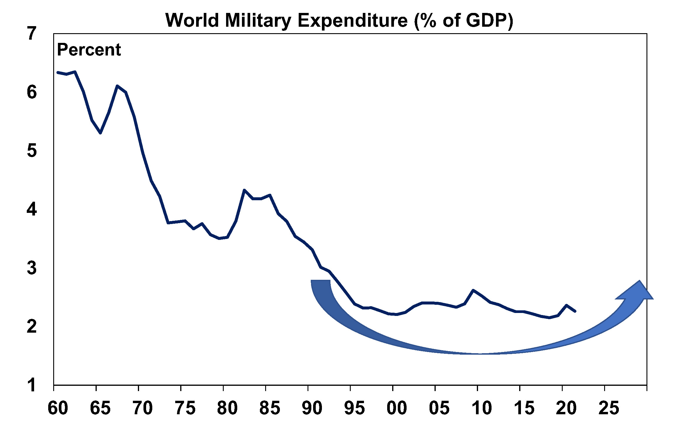 Over much of the last 60 years world military spending as a share of global GDP has been in decline. The most recent fall started in the 1980s and got a push along by the ending of the Cold War. This took pressure off metal prices (as military spending tends to be metal intensive) and it helped keep government spending down, which freed up resources for use by the private sector. Both of which were disinflationary.
