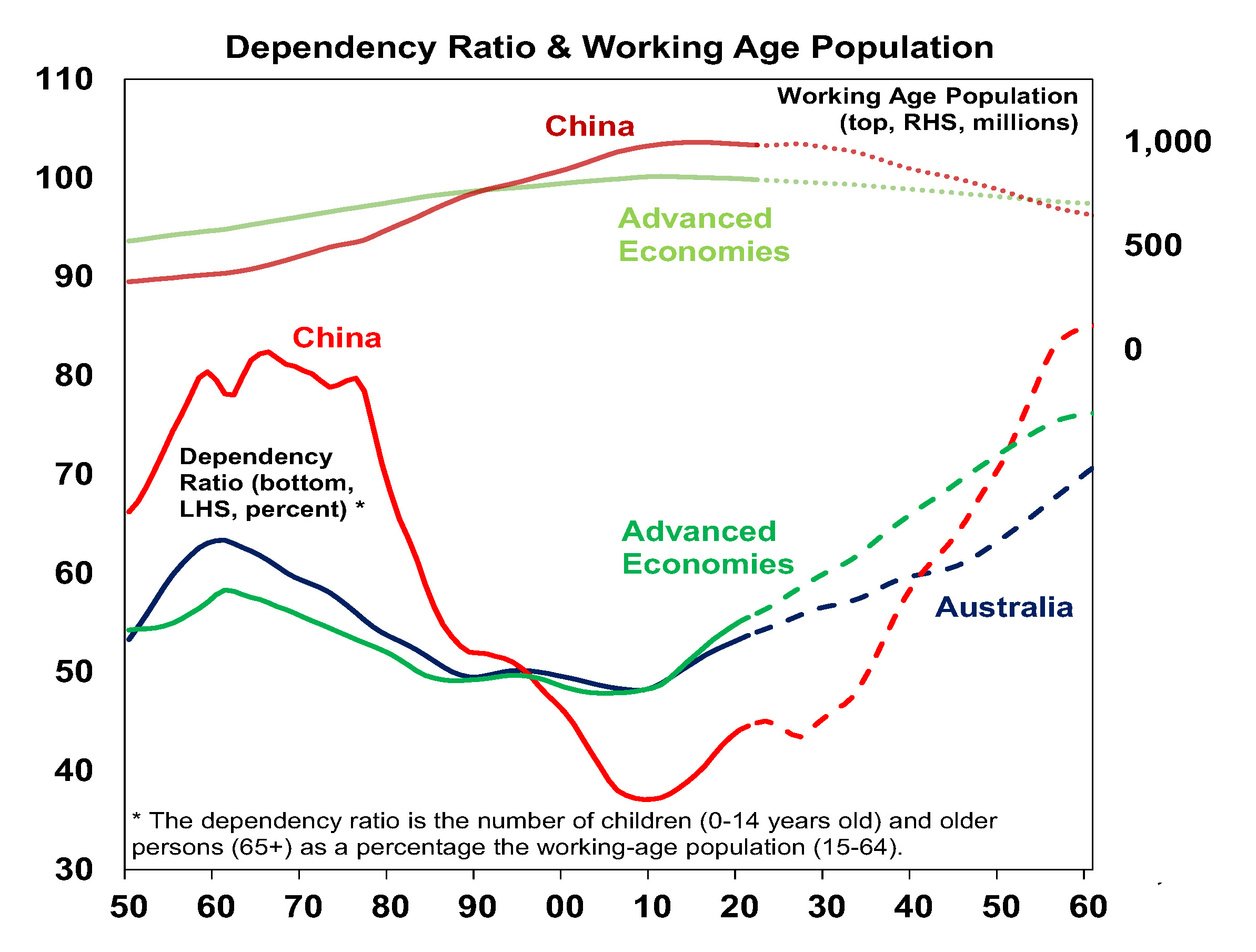 Demographic trends are changing in a number of key ways. Global population growth is slowing, while in advanced countries and China the working age population is now in the process of peaking and starting to decline (see the top portion of the next chart). And, as is well known, populations are aging, resulting in a rise in the ratio of children and older people to working aged people, ie the dependency ratio is rising (bottom portion of the next chart). Thanks to its high immigration program Australia is in a somewhat better position (with a still rising workforce and slower rising dependency ratio). But globally, the upshot is less workers (supply) & more consumers (demand) which will likely add to inflationary pressures. Similarly, “adverse for inflation” demographic trends are flowing from the entry to the workforce of inexperienced millennials and Gen Z as highly experienced baby boomers retire (which is bad for productivity) and the pandemic refocussing workers on quality-of-life making them more demanding in terms of pay and/or retiring early.