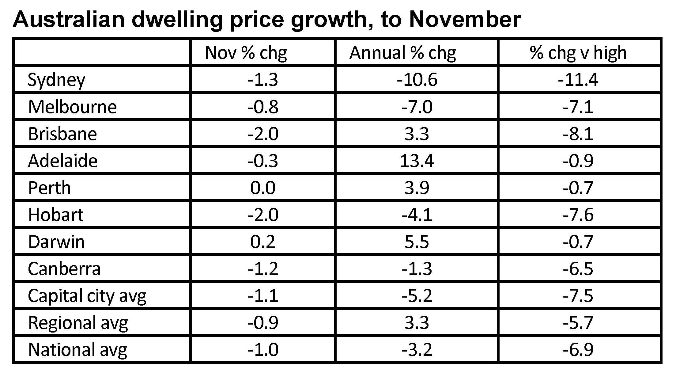 - Australian national average home prices fell another 1% in November and are now down by 6.9% from their high, having seen their steepest fall in the last forty years.