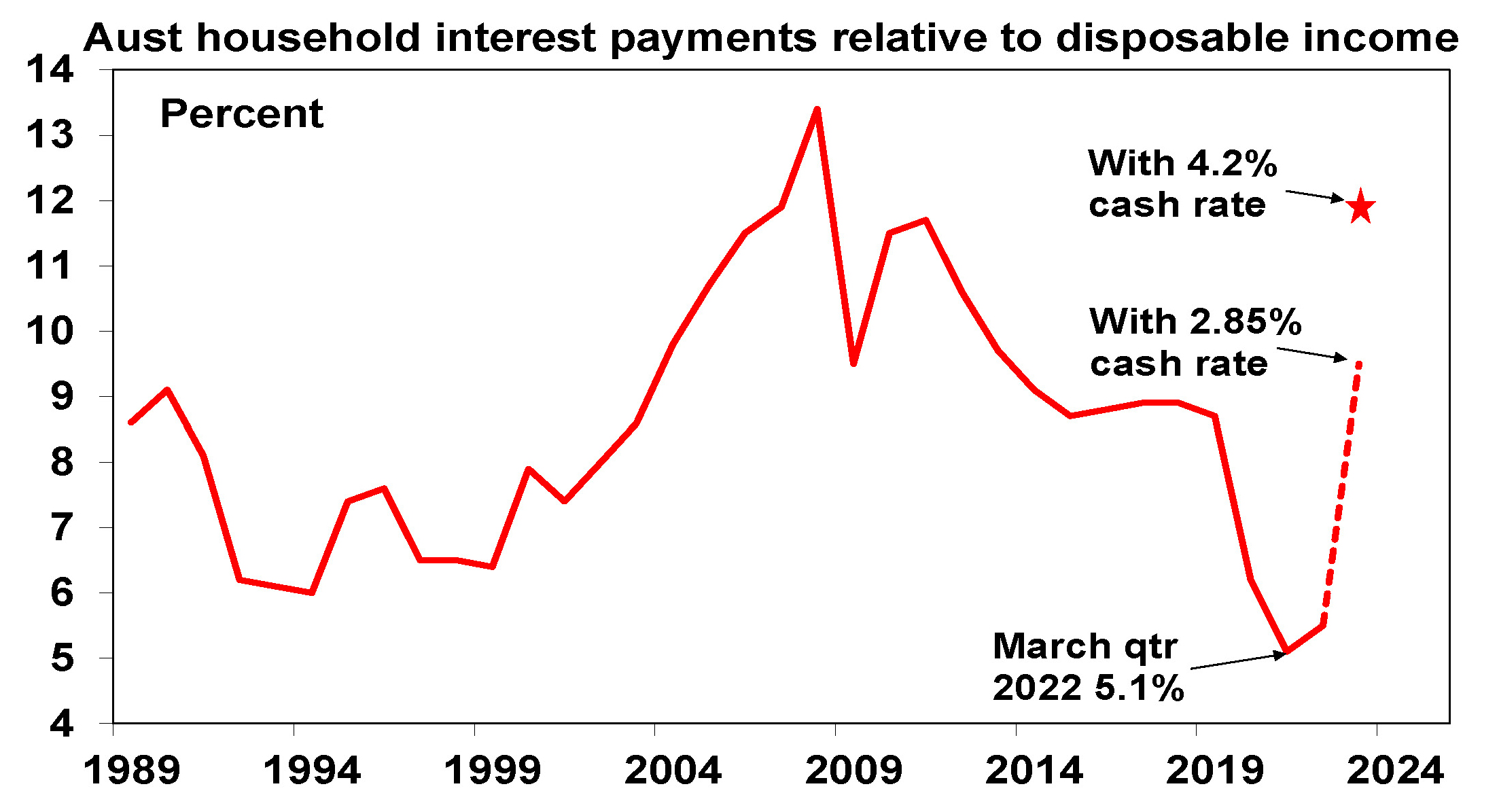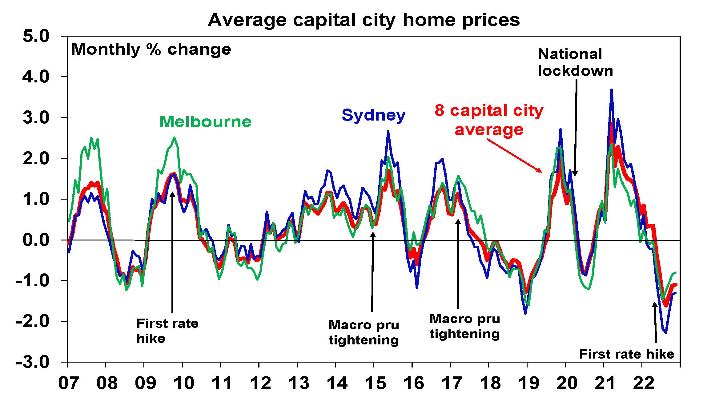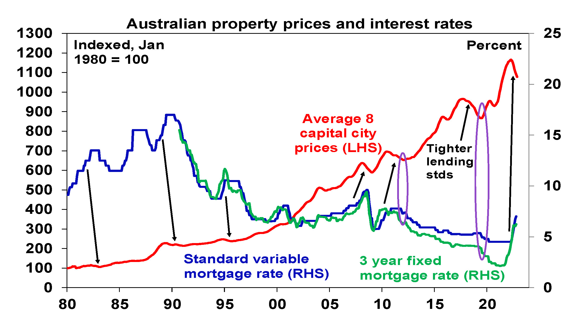 On the upside several factors will help put a floor under prices and eventually drive a recovery. These include: government support programs (eg, home deposit schemes, “Help to Buy” schemes and NSW first home buyers swapping stamp duty for land tax); the tight rental market; & rapidly rising immigration. But for now, the property market will be dominated by higher rates. A pause in rate hikes on its own is unlikely to be enough to drive an upswing in prices as the capacity of buyers to pay will still be depressed. The last two major upswings in property prices that started in 2012 and 2019 required rate cuts before prices started to rise - see the purple ovals in the third chart in this note. Right now, we don’t anticipate rate cuts to start until late next year or early 2024.