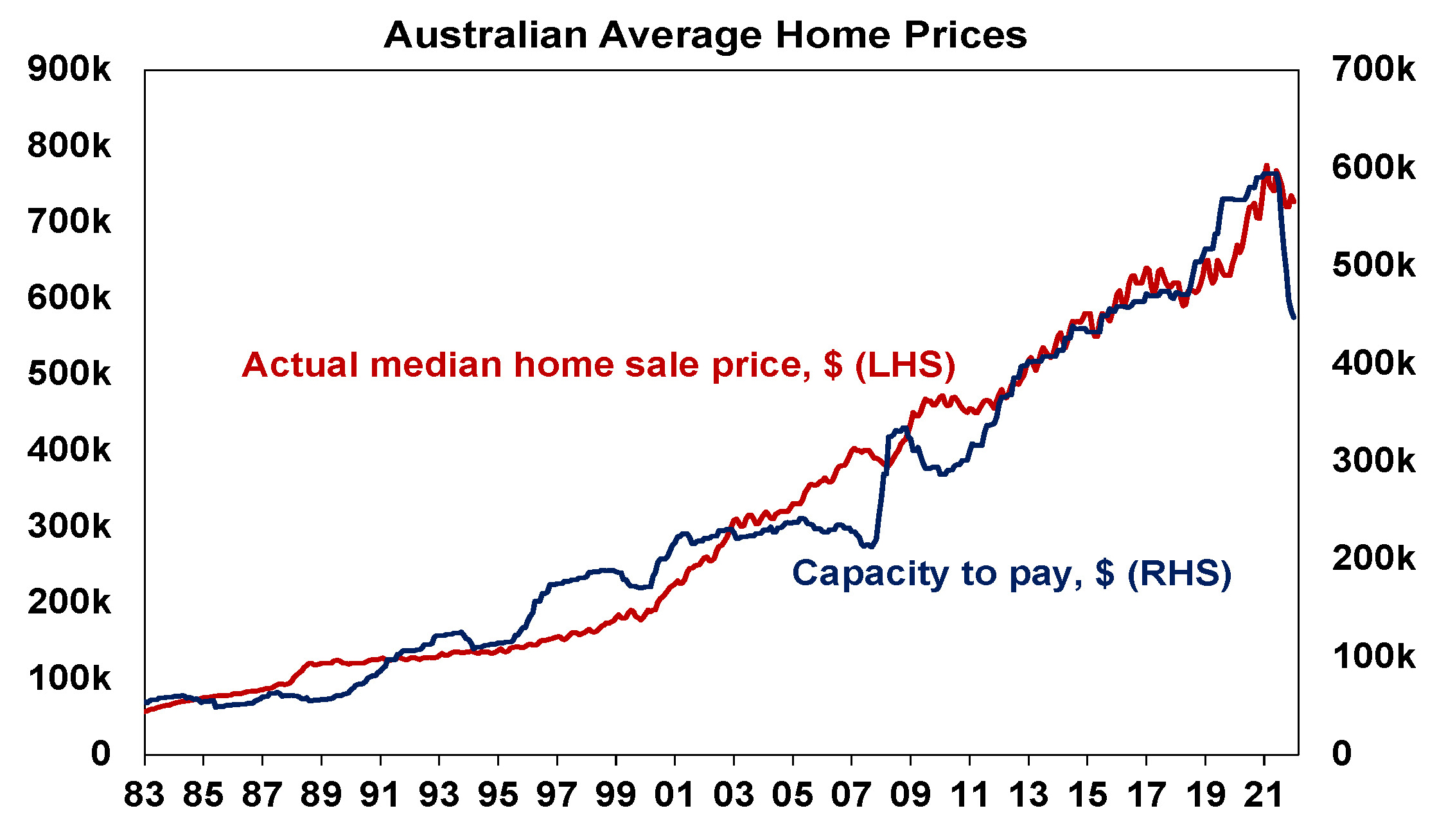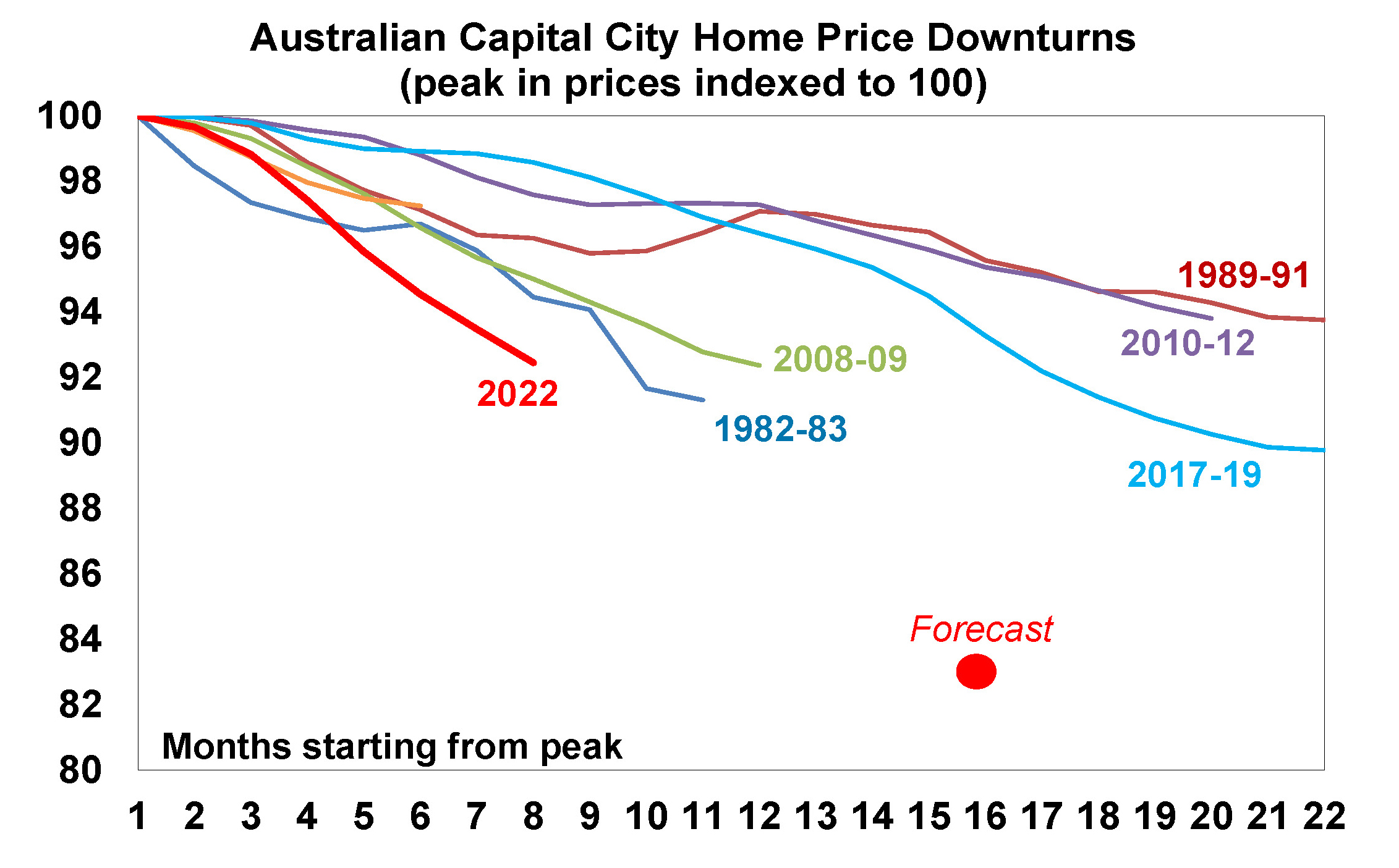 The main risks on the downside are that the RBA raises the cash rate to around 4% (as the money market is assuming) and the economy enters recession. The RBA has already raised rates by more than the 2.5% interest rate serviceability buffer that applied up to October last year. In this scenario home prices could fall by around 30%.