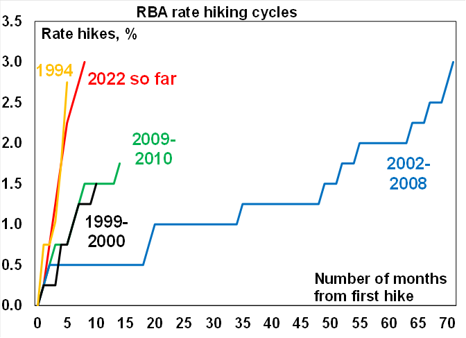 The 3% (or 300 basis point) increase in the cash rate over the eight months since April now exceeds the 1994 tightening cycle - of 275 basis points but spread over 5 months - and equals the 2002-2008 tightening cycle - which amounted to 300 basis points but spread over 71 months. The speed of the rate hikes compared to the last three tightening cycles reflects the extent of the blow out in inflation and the low starting point for the cash rate.