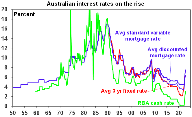 Further rate hikes from here will exceed the tightening cycles seen since 1990. Prior to 1990 the RBA cash rate was not officially announced, and short-term rates were very volatile. In the period January 1988 to November 1989 the overnight cash rate rose from 10.6% to 18.2% but mortgage rates were more regulated then and “only” rose from 13.5% to 17%. See the second chart below. Of course, household debt as a share of income was only 68% back then whereas its now 187% so rates shouldn’t have to go up anywhere near as much as they did in the 1980s to slow spending and hence inflation.