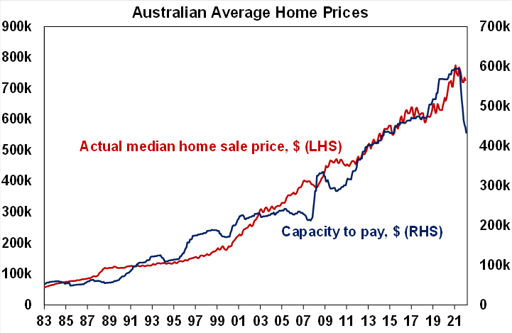 The latest interest rate hike when passed on to mortgage rates will mean that the amount a new buyer on average full-time earnings with a 20% deposit can pay for a home will have fallen 27% from what it was in April – see the Capacity to Pay line in the next chart. So the downwards pressure on property prices will continue for some time yet even if the RBA soon pauses the cash rate.