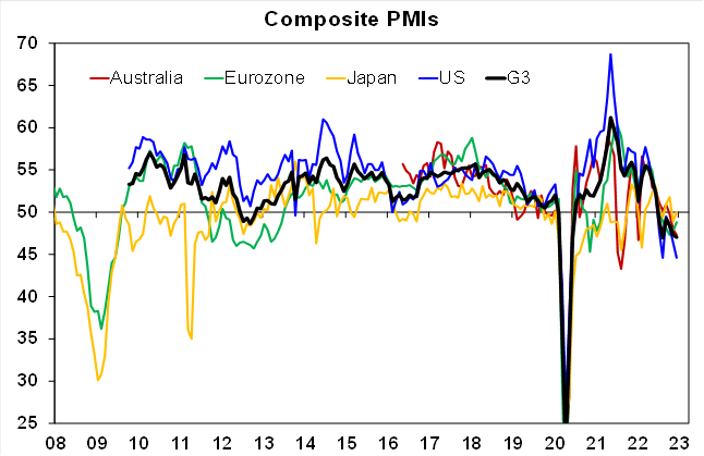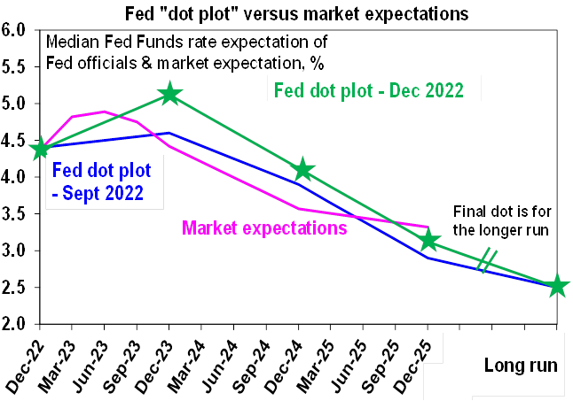However, just as the Fed was too dovish a year ago (signalling just 0.75% of rate hikes for this year when it turned out to 4.25%), its likely now too hawkish. Its understandable that it now wants to err on the side of hawkishness to keep inflation expectations down, to stop financial conditions from easing too quickly (read shares rising too quickly) and it doesn’t want to get caught out as being too dovish again. And its concerns about the still strong jobs market driving services inflation are understandable. But the Fed’s upwards revisions to its inflation forecasts looks too pessimistic and with growth slowing & more signs of peak inflation, we see it as likely to be able to stop hiking from around March.
