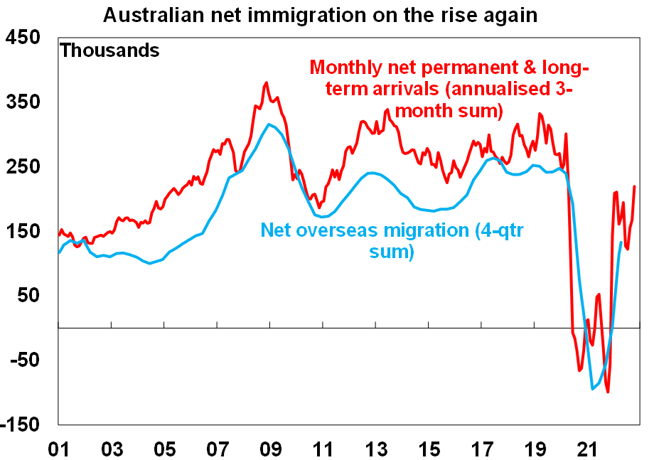 Australian population growth rebounded to 1.1%yoy over the year to the June quarter reflecting the rebound in immigration. Monthly net arrivals points to a further recovery ahead. This should help reduce the shortage of workers going forward.