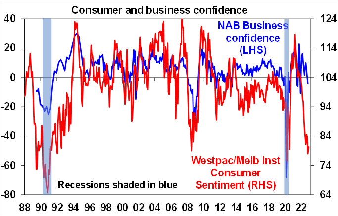 Business confidence catching down to consumer confidence. Consumer confidence rose slightly in December possibly helped by the slowing in rate hikes and talk of a pause, but it’s still very weak. Meanwhile, business confidence fell again. Business remains more upbeat than consumers but this may change as consumer spending slows over the year ahead. The Judo Australian PMI also points to weakening conditions in Australia with the composite falling another 0.7 points in December to a weak 47.3.