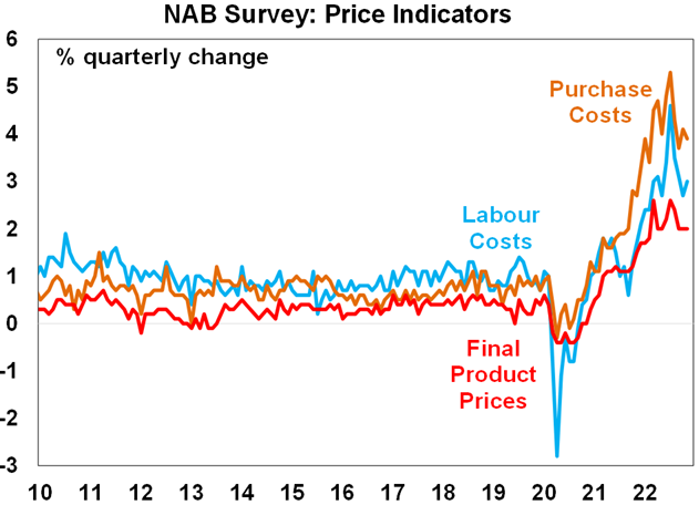 Price and cost pressures according to the NAB business survey are still high, but at least they are in a downtrend. PMI data also showed a further easing in cost pressures in Australia with input prices, backlogs and delivery times all easing although output prices ticked up slightly.