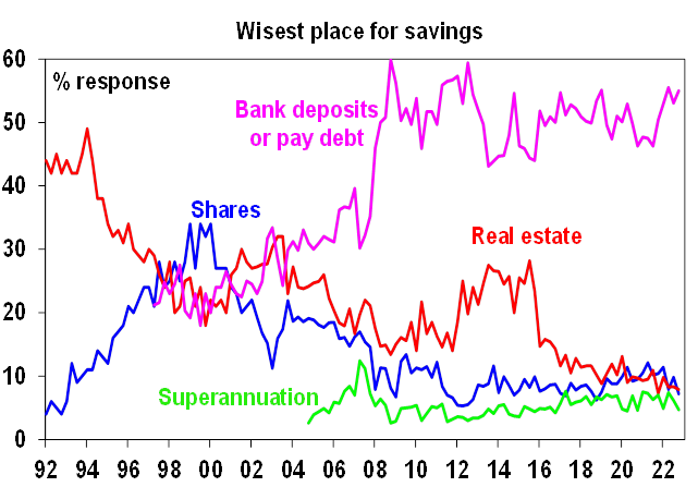 Surveyed consumers in the Westpac/Melbourne Institute survey continue to favour bank deposits and paying down debt with super, shares and real estate remaining out of favour. Shares and super have been out of favour for a long time which unfortunately means that many have missed the solid average returns they have provided over many years.