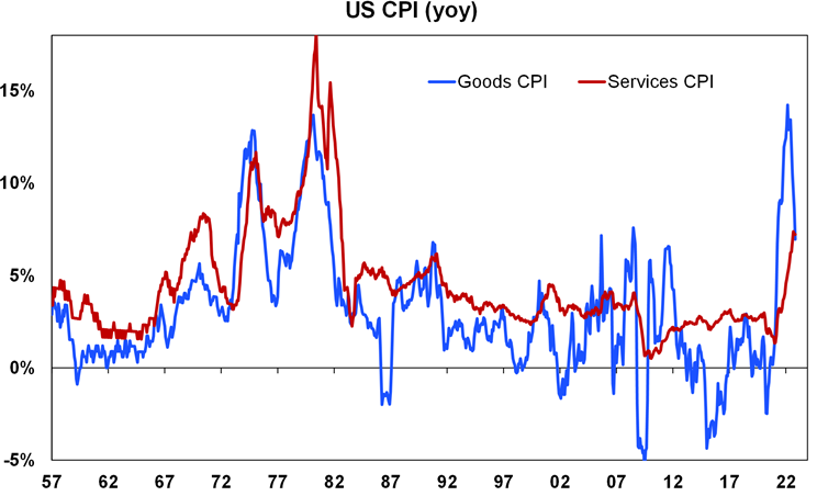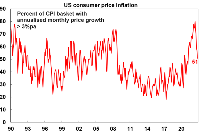 US inflation continuing to fall. Headline and core inflation for November came in weaker than expected with headline inflation at 7.1%yoy now well down from the 9.1%yoy peak seen mid-year. While the slowdown is concentrated in goods inflation, it leads services inflation at major turning points, CPI rents are still rising rapidly but should fall next year following the fall in rents for new leases now occurring and the breadth of rapid price rises has collapsed with only 51% of CPI components now seeing monthly annualised inflation above 3%. Services inflation ex housing remains the Fed’s main concern now, but its already slowing and likely to slow further reflecting the lead from goods inflation and as the labour market slows through next year.