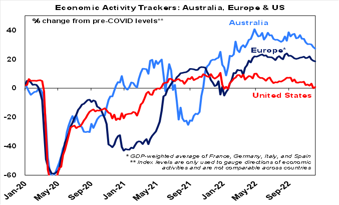 Our Australian Economic Tracker fell again over the last week with falls in confidence, hotel and restaurant bookings and job ads. Our European Activity Tracker also fell whereas our US Tracker rose slightly. All are showing a clear loss of economic momentum from earlier this year.