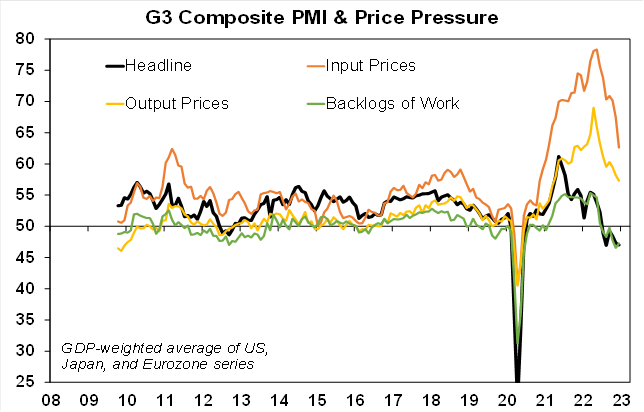 The good news is that inflation pressure continues to ease. The PMIs showed a further easing in input and output prices and reduced work backlogs and delivery times compared to 12-18 months ago. This adds to signs that inflation pressures are easing.