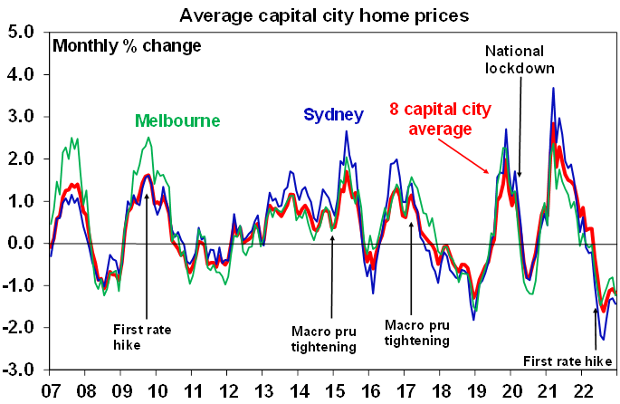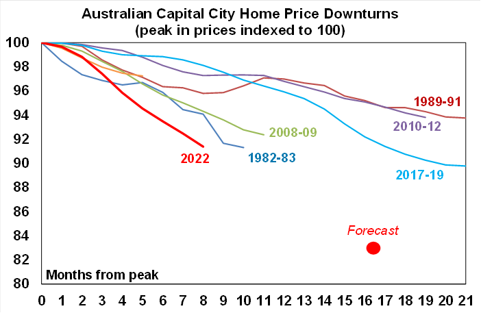 On the upside several factors will help put a floor under prices and eventually drive a recovery. These include: government support programs (eg, home deposit schemes, “Help to Buy” schemes and NSW first home buyers swapping stamp duty for land tax); the tight rental market; & rapidly rising immigration. But for now, the property market will be dominated by higher rates. A pause in rate hikes on its own is unlikely to be enough to drive an upswing in prices as the capacity of buyers to pay will still be depressed. The last two major upswings in property prices that started in 2012 and 2019 required rate cuts before prices started to rise - see the purple ovals in the third chart in this note. Right now, we don’t anticipate rate cuts to start until late this year or early 2024.