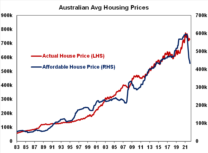 The combination will result in a further weakening in demand and a potential increase in supply as some financially stressed homeowners sell. In terms of the former, the next chart shows actual home prices compared to an estimate of what a buyer - with a 20% deposit, average full-time earnings and mortgage payments assessed at 28% of their income – can afford to pay for a home. The shift in mortgage rates from 17% in 1989 to record lows in 2020 around 2-3% was the main enabler of the surge in home prices and price to income ratios over the last three decades. In other words, record low mortgage rates were reflected in record high home prices. While it can be seen from the chart that there are deviations and there are lots of other factors impacting home prices (supply, immigration, household size, taxation, help from “mum and dad”, home size and quality, and government incentives), over time home prices are tied to what people can afford to pay. But since April the amount an average new buyer can afford to pay has dropped by roughly 27% from around $600,000 to around $440,000. This demand side impact has been the key driver of home price falls so far, but suggests there is much more to go.