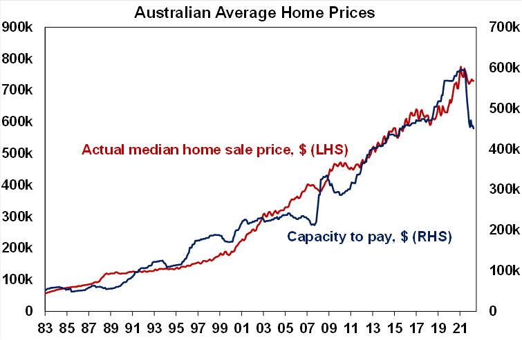 The main risks on the downside to our view is that the RBA raises the cash rate to above 4% (as many are now forecasting) and the economy enters recession. The RBA has already raised rates by more than the 2.5% interest rate serviceability buffer that applied up to October 2021 so many mortgage holders are now paying rates above those that their bank assessed them on. In this scenario home prices risk falling by around 30% from their high.