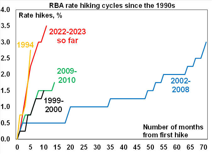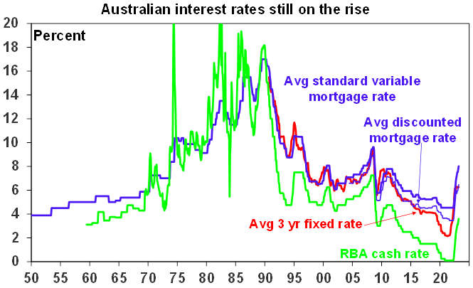 The 3.5% (or 350 basis point) increase in the cash rate over the eleven months since rate hikes started in May last year now clearly surpasses all of the rate hiking cycles seen since 1990 and is the fastest tightening since the rise in the overnight cash rate from 10.6% to 18.2% between January 1988 and November 1989. Back then the RBA cash rate was not officially announced which may have reduced its initial effectiveness, short-term rates were very volatile and mortgage rates were more regulated then and “only” rose from 13.5% to 17%. See the second chart below. Of course, household debt as a share of income was only 68% back then whereas its now 188% so rates shouldn’t have to go up anywhere near as much as they did in the 1980s to slow spending and hence inflation.