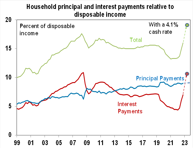 - While several other central banks have rates well above those in Australia (ranging from 4% in the US to 4.75% in the US and NZ) this may not be appropriate for Australia. Compared to the US where 95% of mortgages are 30 year fixed rate loans Australian households are far more sensitive as two thirds of mortgages are variable rate and the one third on fixed rate loans are only short dated with two thirds of these resetting to much higher rates this year.