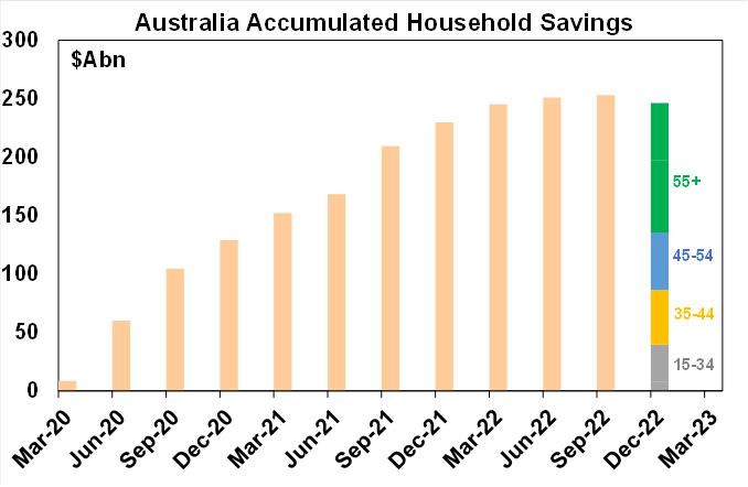 - While the RBA and others have been referring to excess saving buffers built up through the pandemic as a support for consumer spending, relying on this may be dangerous. These are thought to be around $250bn-$300bn and are bigger relative to household income in Australia compared to many other economies and they are often cited as a reason for uncertainty about the outlook for consumer spending as they could support higher than expected consumer spending as the buffers are spent offsetting the drag from rate hikes. However, there are numerous complications with this. First, their estimation is very rough being the gap between actual savings through the pandemic compared to what it normally might have been – but the estimate of saving is messy as it’s just the residual from income after consumption and not actual measured savings. Second, the savings buffer is not really evident in bank deposits which are running roughly in line with their long-term trend (or just $44bn above it - see the next chart) – suggesting any excess saving is not intended for future spending but may have been used to reduce debt or invest including via superannuation (although there is not much evidence of the latter). And finally, while the excess savings may make life easier for households that used them to pay down debt, they appear to be substantially skewed towards older people who may not adjust their spending much anyway as they are more focussed on saving for retirement. Whereas for younger newer entrants to the property market buffers are likely to be far less significant or non-existent. For these reasons its dangerous to rely on the so-called buffers as a significant source of upside support for consumer spending in Australia.