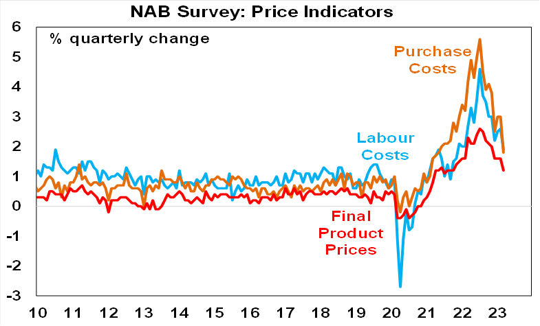 The March NAB survey showed a further fall in cost and price pressures – which are now all well down from their high last year.