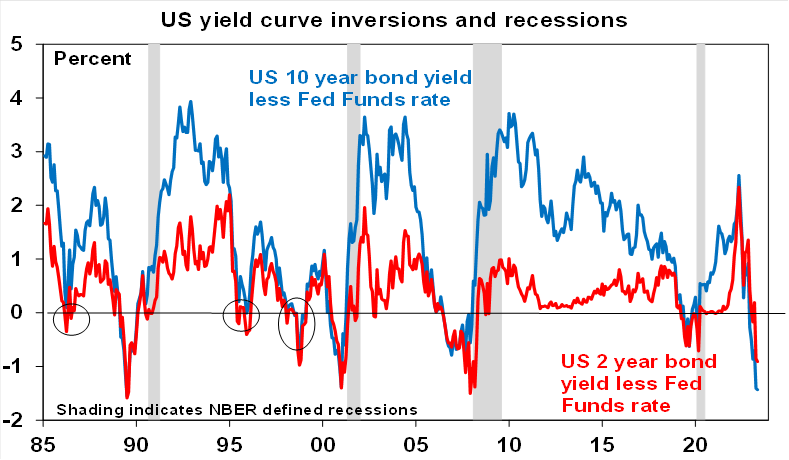 Yield curves continuing to point to a high risk of US recession – and that the Fed has probably done enough. A sharp fall in bond yields since February and still rising short term interest rates has seen US yield curves invert further (ie long term rates fall further below short term rates). Even the near term yield curve – which some at the Fed appear to prefer – as proxied by the gap between the 2 year bond yield and the Fed Funds rate - has now inverted. Over the last 50 years all US recessions have been preceded by inverted yield curves as is the case now – but the lag can be up to 18 months and it can give false signals. At the very least the plunge in 2 year bond yields below the Fed Funds rate is signalling that the market expects that the Fed has probably done enough to control inflation and that the Fed will cut rates over the next two years.