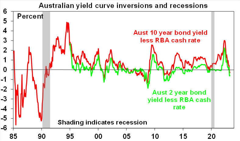 In Australia, the yield curve has also now inverted warning of a rising risk of recession - but its track record in signalling recession is poor. The decline in long term rates below the cash rate is signalling though that the money market expects that the RBA has probably also done enough to control inflation.