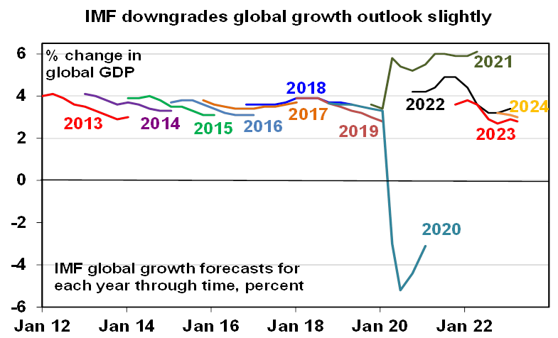 Underlying the soft global growth outlook the IMF revised down its global growth forecasts for this year and next citing the banking problems and sticky inflation, but the revisions were minor and were nothing new for investment markets. The IMF’s growth forecasts for 2023 and 2024 were both revised down – but only by 0.1% to 2.8% and 3% respectively which leaves them little changed from where they have been since mid last year and not way out of line with pre-pandemic average growth rates – see the next chart. The IMF sees inflation in advanced countries falling to 2.6% in 2024. While the IMF expects Australian growth to slow to 1.6% this year and 1.7% next year this is similar to RBA forecasts (and a bit stronger than our own) and is a bit stronger than its expectations for growth in other advanced countries. The good news for Australia is that the IMF expects China’s economy to grow 5.2% this year and 4.5% next year.