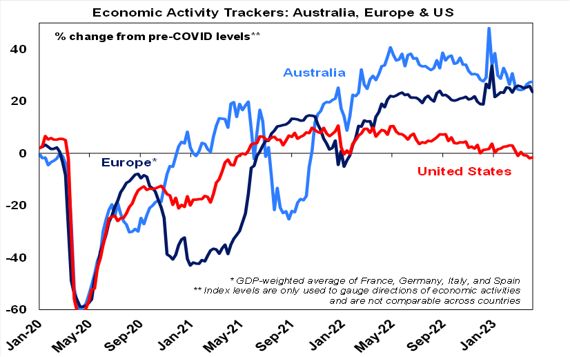 Economic activity trackersOur Economic Activity Trackers rose slightly in the last week in the US and Australia but fell slightly in Europe. The basic picture is soft but there is still no sign of a collapse.