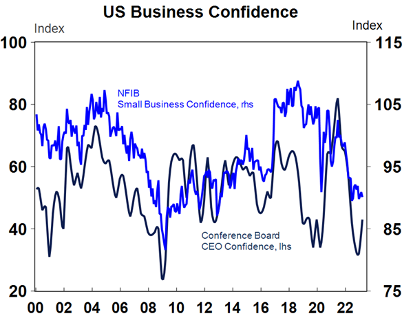 Meanwhile confidence improved a bit with consumer confidence up 9.4% in April after the RBA paused rate hikes but to a still very weak reading of 85.8pts. Business confidence rose slightly in March according to the NAB business survey but business conditions slowed slightly albeit remaining strong.