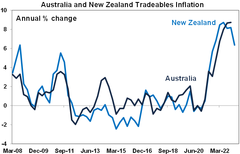 Inflation pressures are continuing to recede. Following the fall in US inflation for March, inflation data in Canada, New Zealand and to a lesser extent the UK all fell in March and by more than expected in Canada and New Zealand. The plunge in tradeable inflation (goods and services that are imported or in competition with imports) in New Zealand suggests reasonable prospects for a similar fall in Australia – see the next chart. Inflation also fell more than expected in Malaysia and the Indonesian central bank left rates on hold.