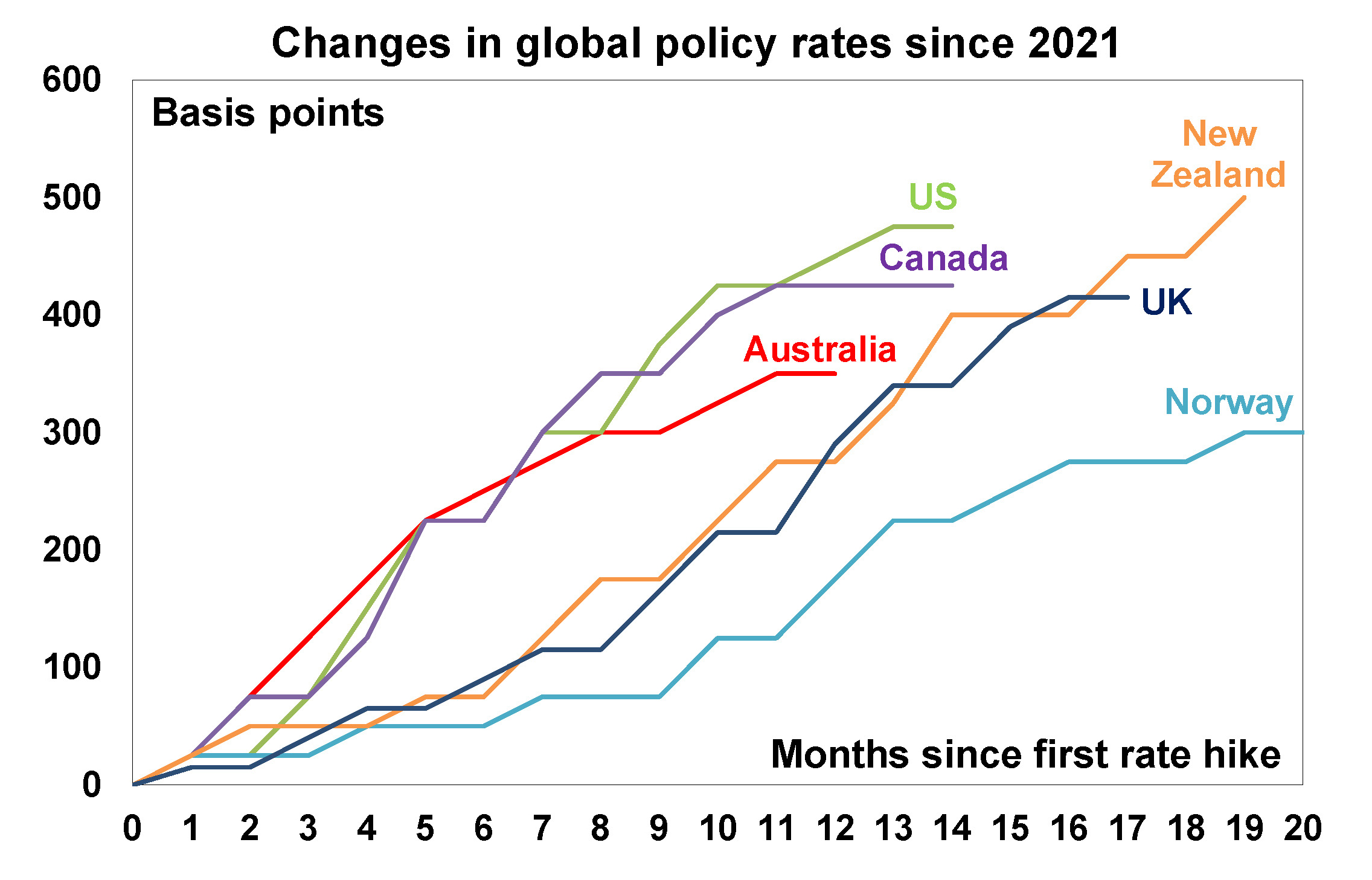 - Raising interest too aggressively over the last year and in the process not allowing for the threat to indebted households and unemployment and or enough time to assess the lagged impact of rate hikes. While I too have concerns on this front its too early to say who is right, particularly with inflation still high and unemployment still very low (and below most estimates of full employment). And by raising rates a bit less (so far) than many other major central banks the RBA has arguably been more balanced in hiking that others have been.